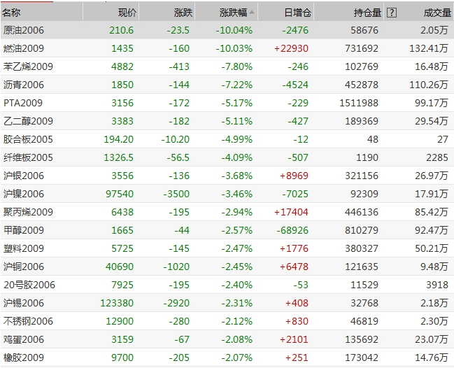 值得注意的是,国内期市午盘大面积飘绿,能化品大跌,原油、燃油封跌停,苯乙烯跌近8%,沥青跌逾7%,PTA、乙二醇跌逾5%,聚丙烯、甲醇、塑料、20号胶、橡胶跌逾2%;有色金属低迷,沪银、沪镍跌逾3%,沪铜、沪锡跌逾2%。