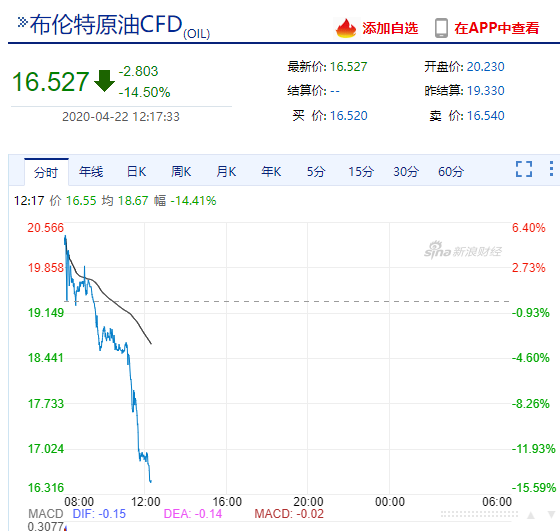 今日,布油6月合约跌超14%,报16.53美元/桶,刷新1999年中底以来新低。美油6月合约也由涨转跌。