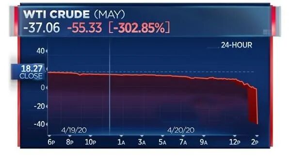 美国原油期货价格当地时间20日暴跌,5月交货的WTI原油期货价格暴跌约300%,收于每桶-37.63美元,历史首次跌入负值,盘中最低报每桶-40.32美元。油价负数意味着将油运送到炼油厂或存储的成本已经超过了石油本身的价值。