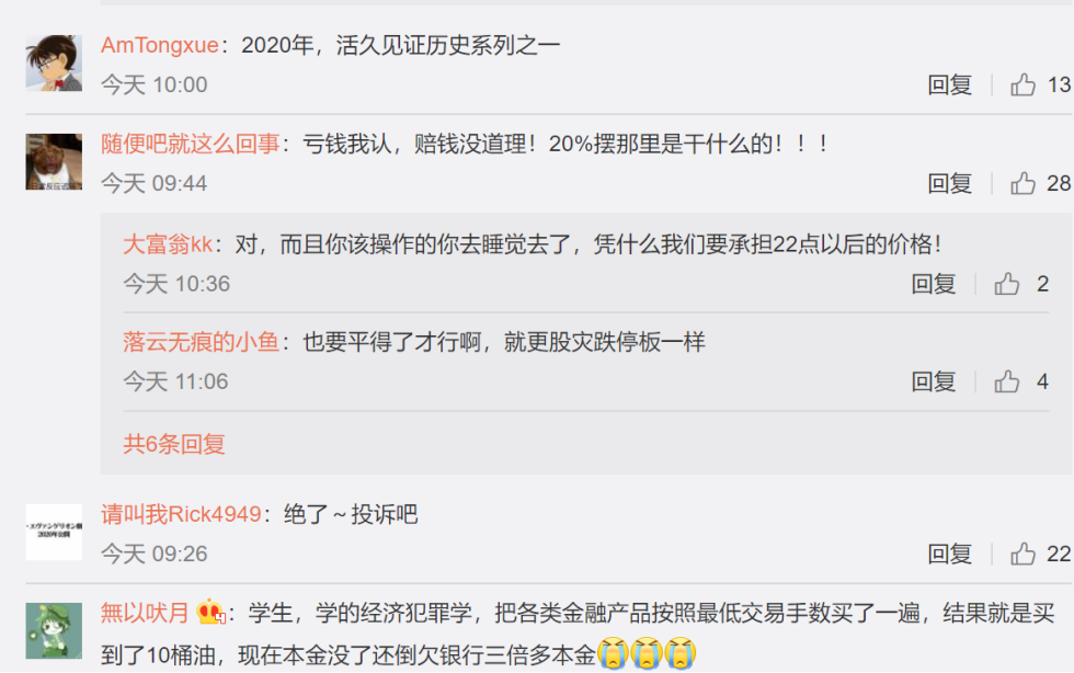 尽管抄底者过于乐观,没想到预见油价报负值的黑天鹅事件,但在纸原油账户穿仓后,不少投资者也纷纷开始质疑银行风控的不足,导致投资者的巨亏。