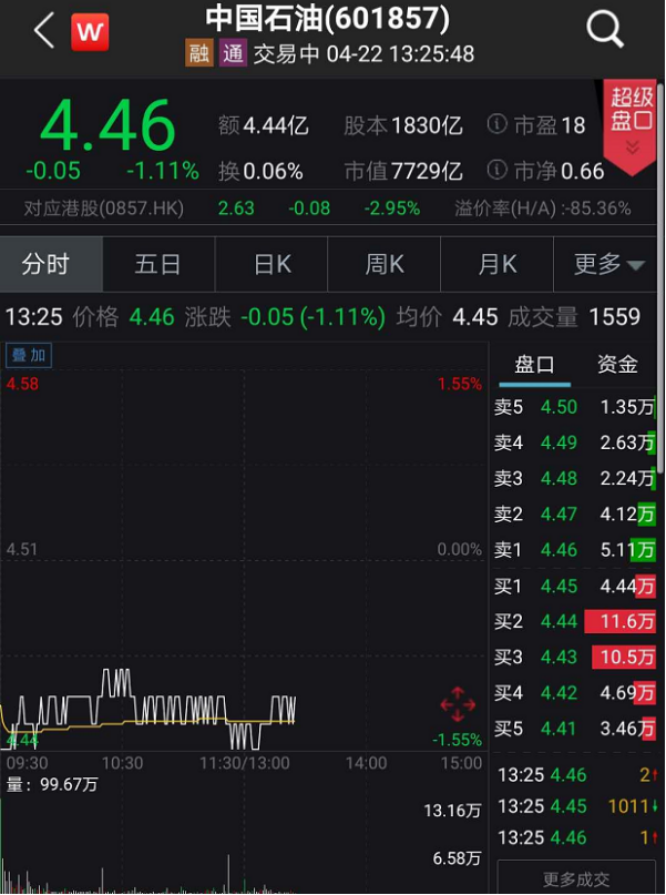 二级市场,石油股集体大跌,中国石油盘中股价最低下探4.43元,创下近30个交易日来第11次刷新历史最低价。