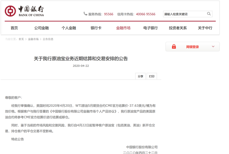 4月22日,中国银行回应原油宝客户,经该行审慎确认,美国时间4月20日,WTI原油5月期货合约CME官方结算价-37.63美元/桶为有效价格。同时中国银行表示,4月22日起原油宝暂停新开仓。