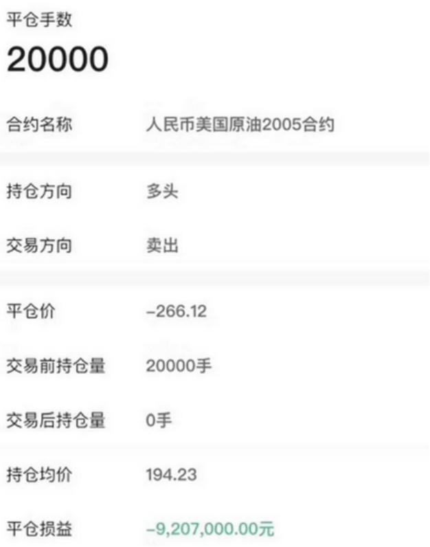 另据投资者曝光的一份结算单显示,投资者开仓本金是194.23元,本金388.46万元,平仓价-266.12元。现在总体亏损920.7万元,倒欠银行532.24万元。中国银行已经发出通知,要求投资者补充这部分穿仓亏损。