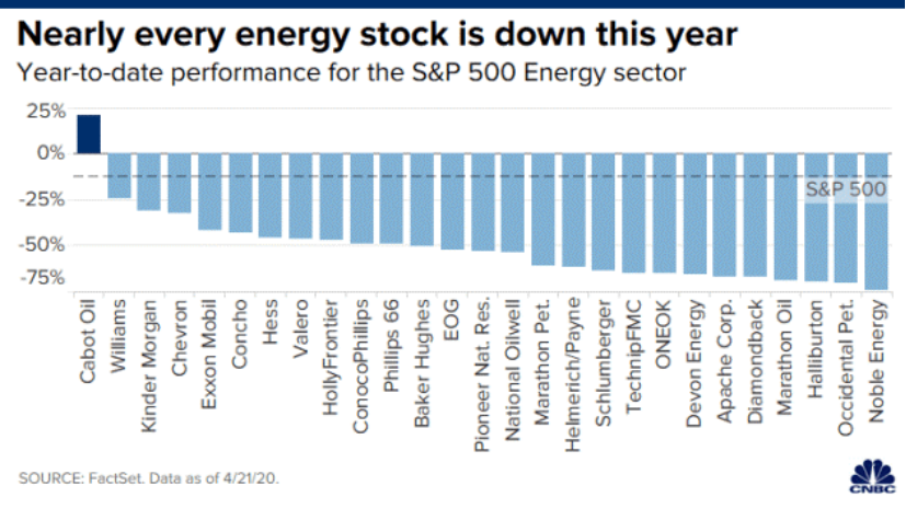 据CNBC报道,美国龙头企业如来宝能源(NBL)、哈里伯顿(HAL)、马拉松石油(MRO)和西方石油(OXY)的损失都超过了60%,埃克森美孚(XOM)也下跌了约38%。