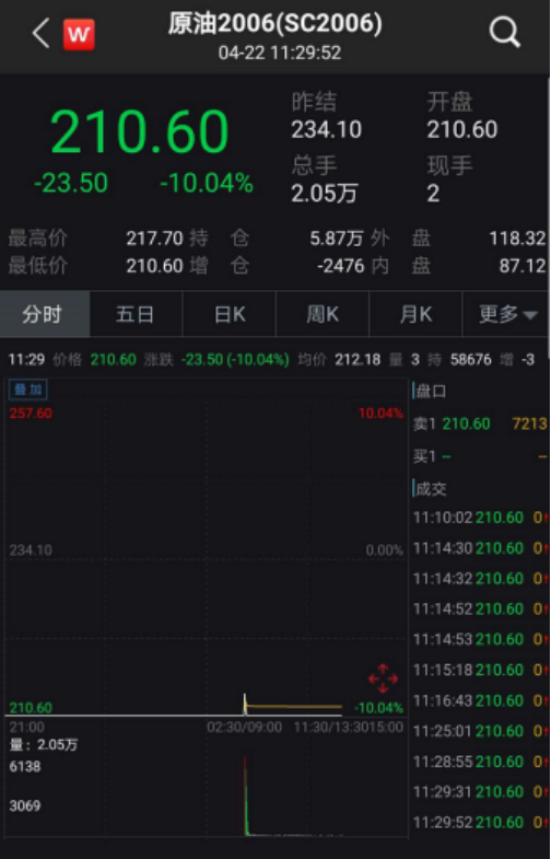 4月22日,国内期市开盘,上海原油期货主力合约开盘跌停。