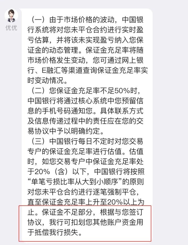 而多数投资者可能并没有注意到,根据原油宝投资协议,保证金不足部分,中国银行可扣划投资者其他账户资金用于抵偿该行损失。