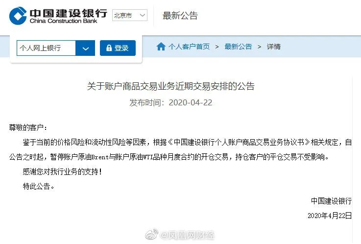 建设银行:暂停账户原油Brent与账户原油WTI品种月度合约的开仓交易