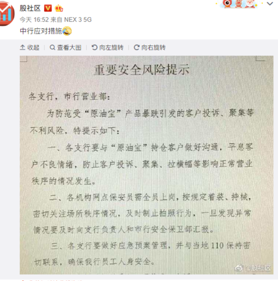 另外,今日,网传中行下发重要安全提示,称要与原油宝客户做好沟通。