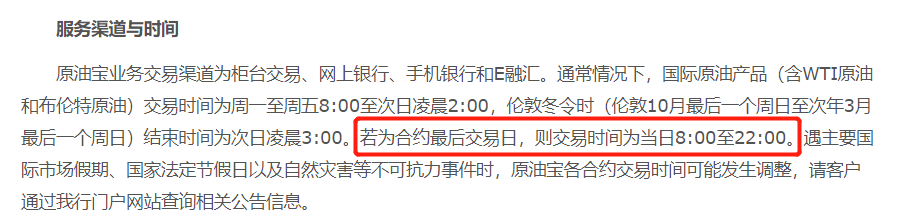 记者查询中行原油宝产品简介发现,其中“服务渠道与时间”一项确实说明了“若为合约最后交易日,则交易时间为当日8:00至22:00”。也就是说从条款上来看,中行确实不存在操作失误的问题。