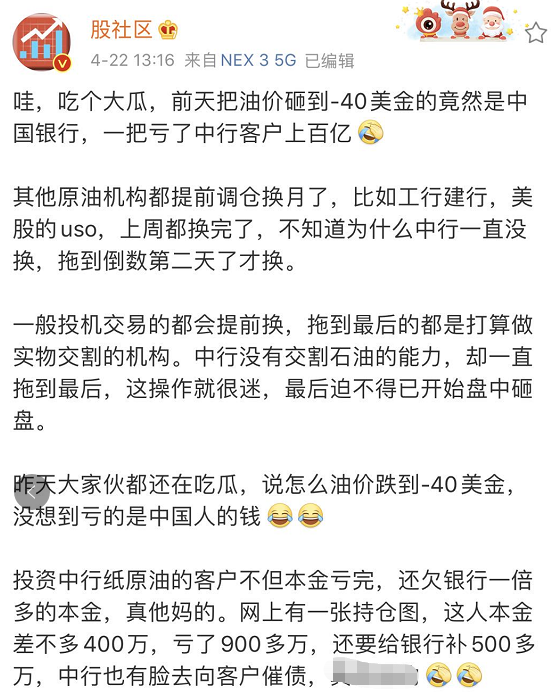 导致的直接后果是,多头持仓不仅本金全部损失,仍需向银行追加资金,以填补负油价带来的持仓亏损……