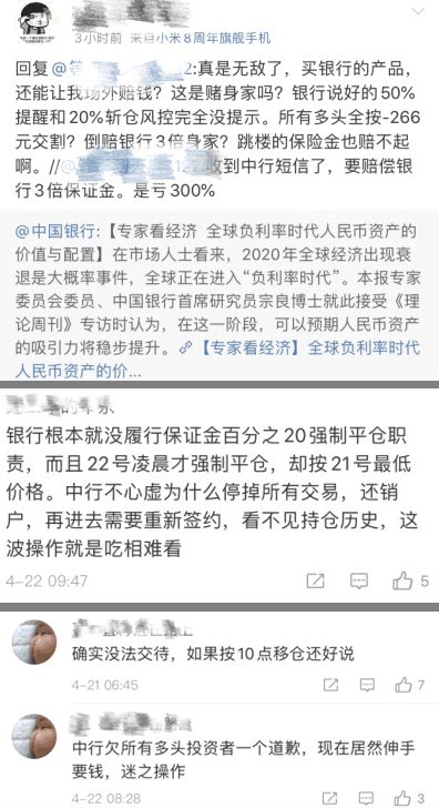 中国银行“原油宝”(即个人账户原油业务)产品的投资者资金遭“血洗”,甚至出现“穿仓”——保证金赔光的同时还需要向“倒贴”银行两倍的资金。