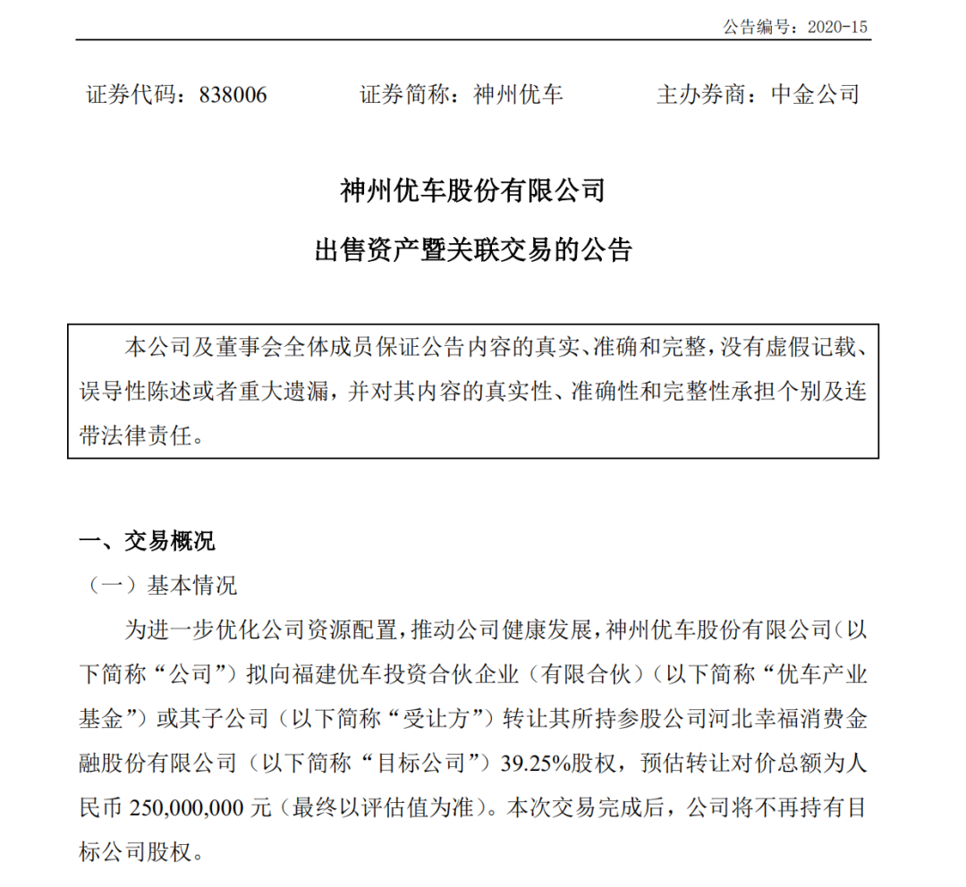 除此之外,神州优车继续出售资产“求生”。今天神州优车发布出售资产暨关联交易的公告,称为进一步优化公司资源配置,推动公司健康发展,拟向优车产业基金或其子公司转让其所持参股公司河北幸福消费金融股份有限公司39.25%股权,预估转让对价总额为2.5亿元。本次交易完成后,公司将不再持有目标公司股权。