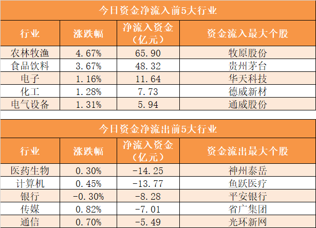 28个申万一级行业中,16个行业实现资金净流入,其中农林牧渔行业净流入65.9亿元居首。