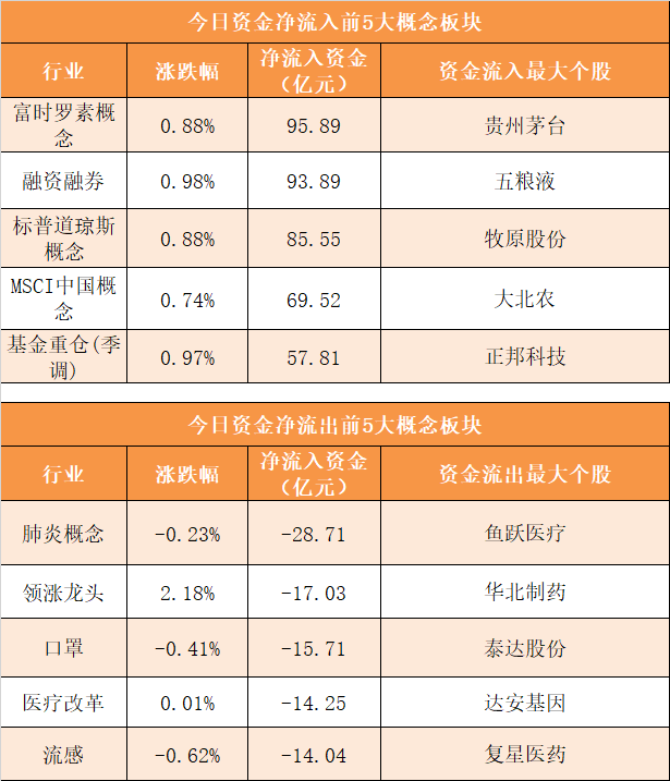 概念板块方面,今日富时罗素概念、融资融券、标普道琼斯概念、MSCI中国等概念板块资金呈现净流入,其中富时罗素概念净流入95.89亿元居首。