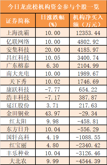 盘后龙虎榜数据显示,机构现身17股,其中上海洗霸等10只股票呈现机构资金净买入,大北农等7股呈现机构资金净卖出。