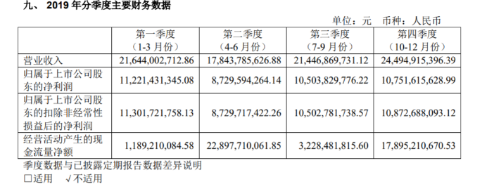 从2019年的四个季度表现来看,净利润分别为112.21亿元、87.30亿元、105.04亿元和107.51亿元,第四季度表现符合预期。