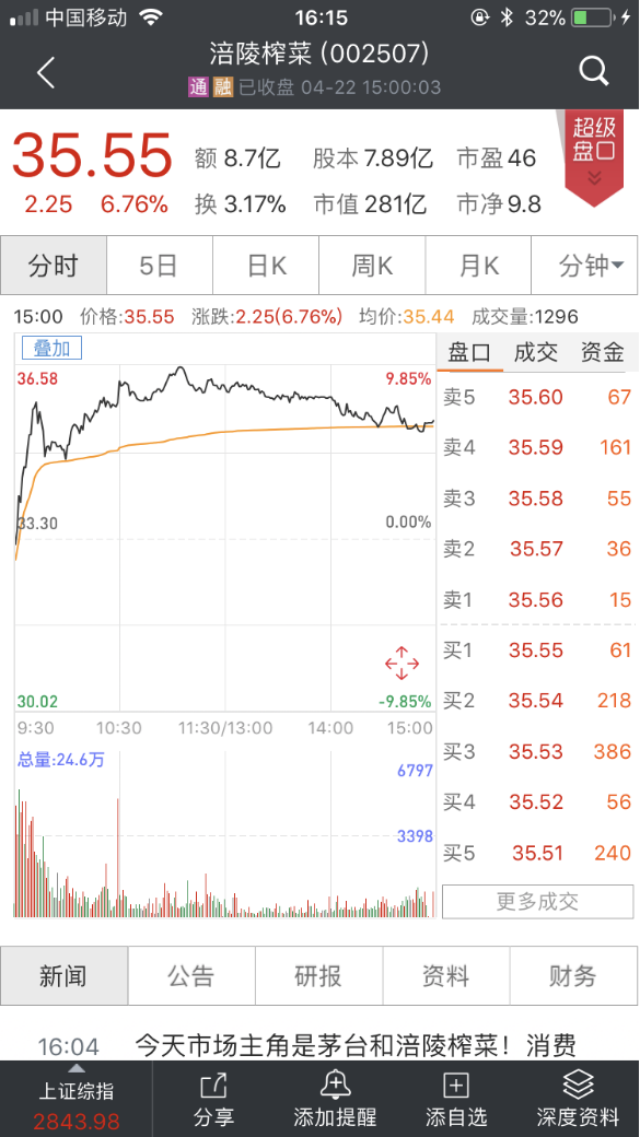 股价创新高的还有涪陵榨菜。今天早盘涪陵榨菜便大涨8%,盘中一度逼近涨停,股价最高36.58元/股,尾盘有所回落,最终收于35.55元/股,涨幅6.76%,总市值281亿人民币。