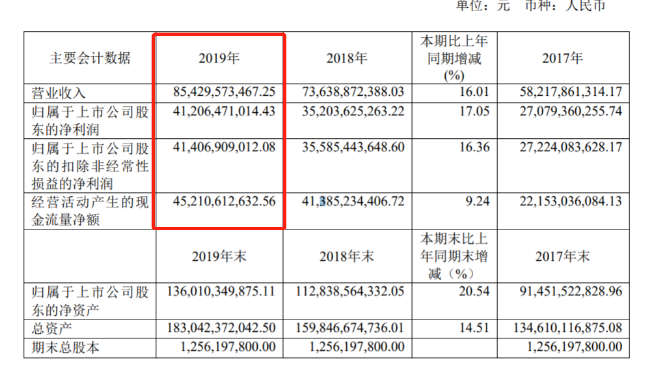 年报显示,2019年贵州茅台2019年营收达854.3亿、同比增长16.01%。实现营业利润 590.41 亿元,同比增长 14.99%。归属于母公司所有者的净利润412.06亿元,同比增长17.05%。
