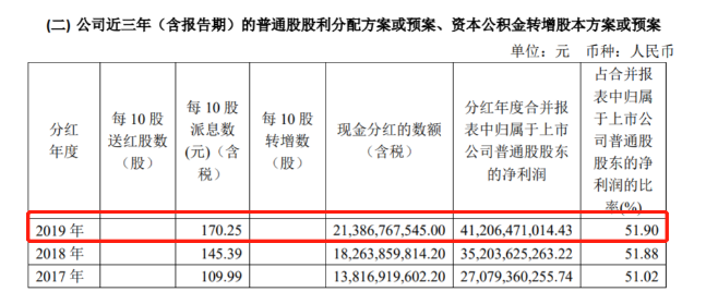 年报中称,公司推出了拟每10股派发现金红利170.25元(含税)的分配方案,现金分红数额213.87亿元,分红比例达51.9%。