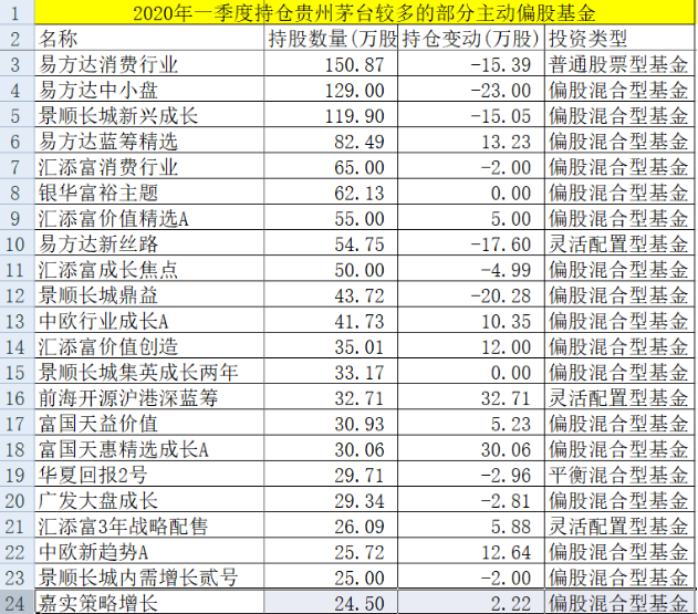 具体基金来看,一季度有455只基金一季度加仓贵州茅台。主动管理基金中,加仓幅度最大的是前海开源沪港深蓝筹,一季度加仓32.71万股,贵州茅台成为该基金的第三大重仓股。