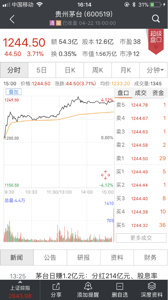 今日开盘,贵州茅台股价一路走强,盘中涨幅一度超4%,股价最高触及1249.5元/股,下午收于1244.5元/股,涨幅3.71%。