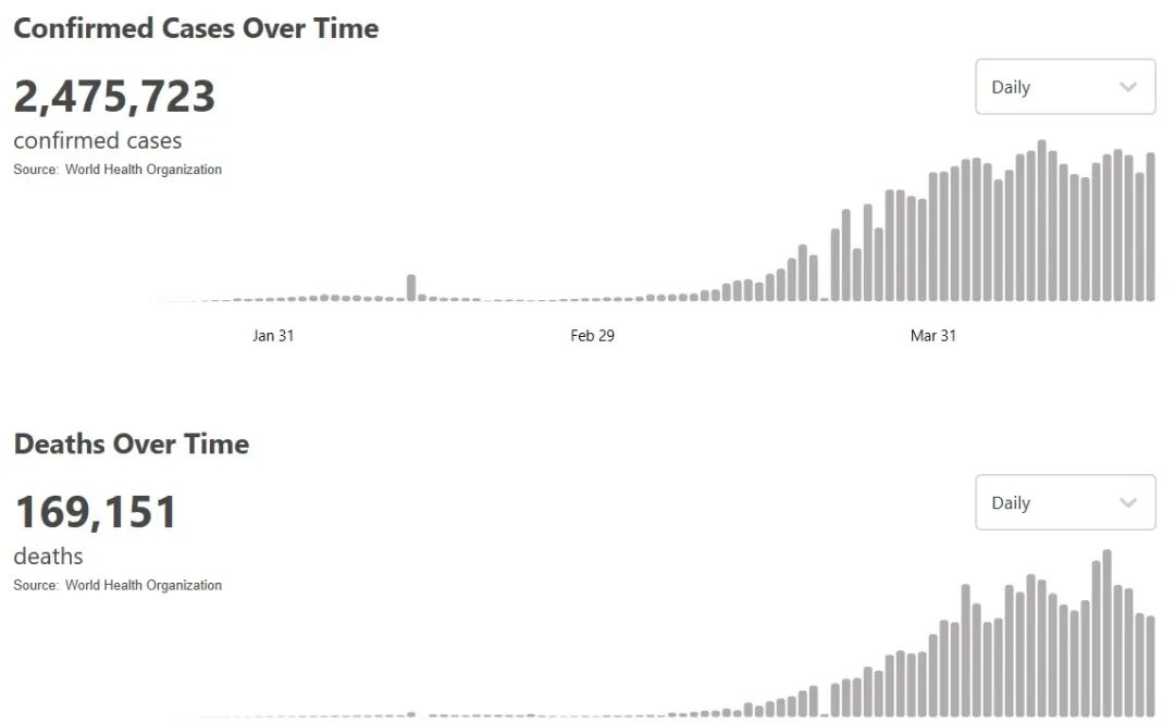 根据世卫组织最新实时统计数据,目前全球确诊新冠肺炎2475723例,死亡169151例。