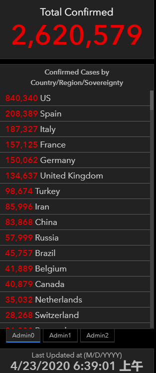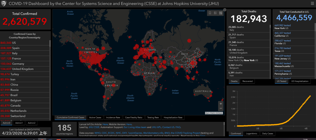 据约翰斯·霍普金斯大学数据,截至北京时间23日6时39分,全球确诊超262万,死亡超18万。美国新冠肺炎确诊病例为846982例,死亡46399例。
