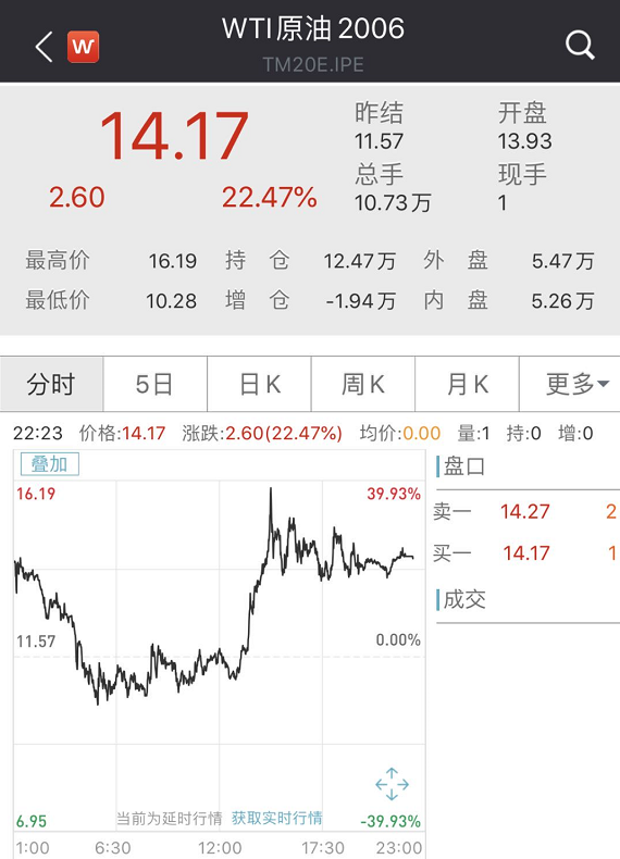 特朗普发帖后,美国原油期货跳涨。原本略有下跌的WTI 6月原油迅速反弹,不到半小时就从逼近11.10美元升破12美元,美股临开盘前,日内涨幅超过20%,突破14美元关口,到美股盘初,一度突破16美元,涨至16.20美元/桶刷新日高,日内涨幅达到40%。