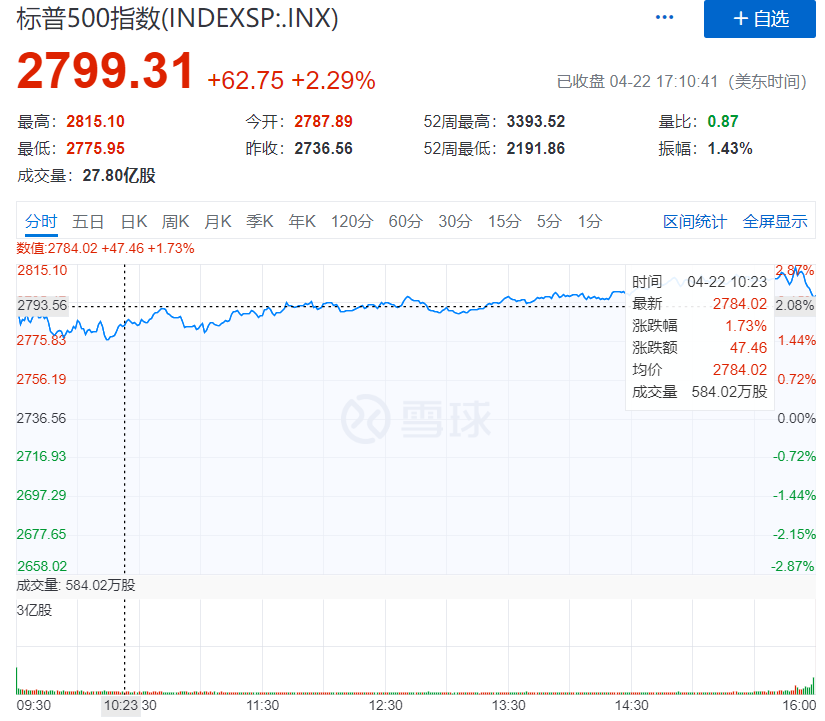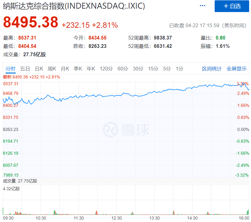 美股收盘三大指数集体收涨,纳指涨2.81%,标普500指数涨2.29%,道指涨1.99%。