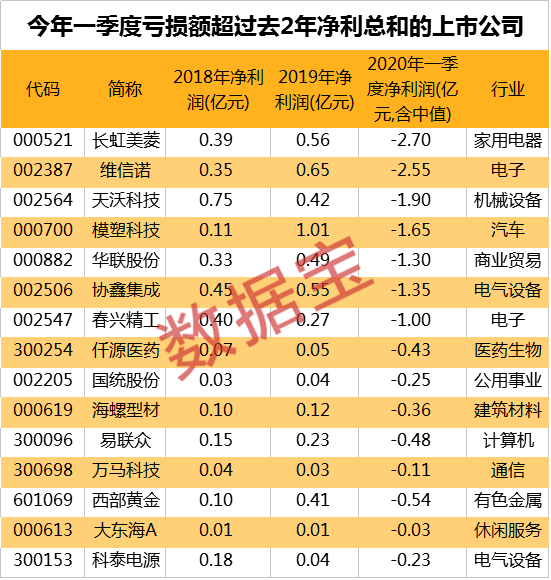 将时间轴拉长发现,长虹美菱过去2年累计净利润仅有0.95亿元,也就是说公司仅用了3个月就亏掉了过去2年的净利润。除长虹美菱外,维信诺、天沃科技、华联股份等14家公司也存在这种情况,其中电子板块维信诺连续6年一季度亏损,今年一季度亏损2.55亿元,而过去两年净利润总和为1亿元。