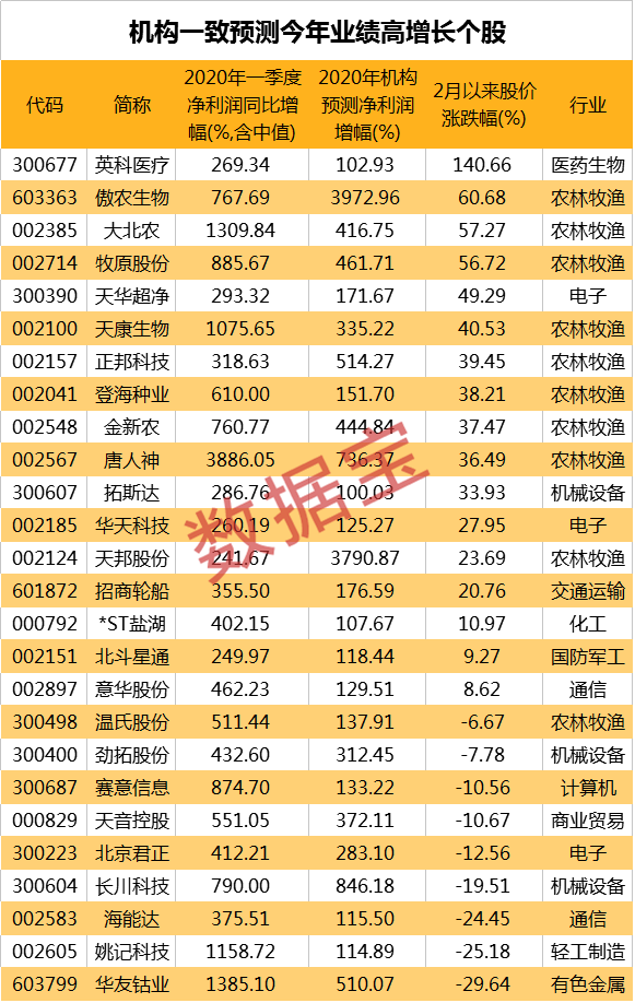 从具体个股来看,机械设备股长川科技一季度净利润增幅中值达到790%,机构预测其2020年净利润增幅接近850%;唐人神一季度净利润同比增幅中值超过3800%,机构预测其2020年净利润增幅超过700%; 正邦科技一季度净利润翻3倍以上,社保基金新进十大流通股名单,为第五大流通股东,机构预测其今年净利润增幅将超过500%;医药股英科医疗一季度净利润增幅接近2.7倍,主要因为疫情的影响,一次性防护手套需求激增,产品售价有一定增长所致。该公司2月份以来股价上涨近1.5倍,机构预测全年净利润将翻倍。
