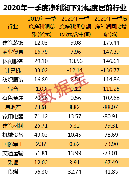 与此同时,7行业一季度整体呈亏损状态,休闲服务、计算机、建筑装饰行业亏损额位居前三,其中计算机行业今年一季度亏损12.14亿元,仅中国长城一家公司就亏损超3亿元。建筑装饰、采掘、有色金属等传统行业整体亏损,同比下滑幅度也超过100%。疫情影响之下,房地产行业也迎来了危机,一季度房地产行业整体盈利仅有8.82亿元,去年同期接近74亿元,其中去年一季度盈利20.85亿元的泛海控股,今年一季度亏损额超1亿。