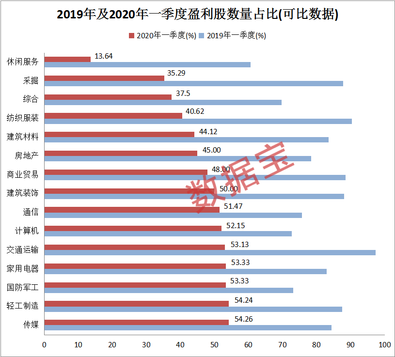 从盈利股数量占行业比例来看,休闲服务行业盈利股数量占比不到15%,而去年同期超过60%;采掘、综合行业一季度盈利股数量占比低于四成,前者比去年同期低了50多个百分点;纺织服装行业仅有四成,大幅低于去年同期水平。传媒行业虽然整体盈利股数量占比超过50%,不过这主要受益于细分板块云游戏股的支撑,而文化传媒板块盈利股数量占比不到三成,仅高于休闲服务,去年同期该比值达到84%。