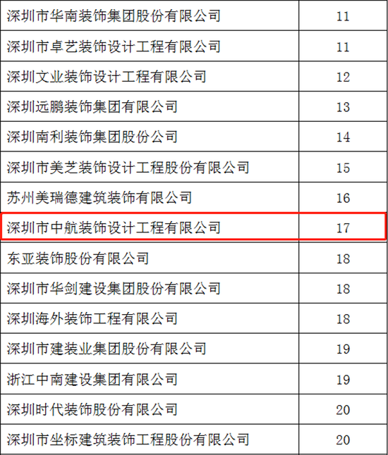 鉴于中航装饰取得的成绩,其已连续九年位居“中国建筑装饰百强企业”、“设计五十强企业”前列,并多年荣获“装饰行业优秀企业”、“十大最具影响力设计机构”、“广东省全国名牌企业”等称号。2019年年中公示的2018年度中国建筑装饰行业综合数据统计结果显示,中航装饰位列榜单第17名。